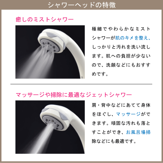 満足の多機能切替! ・水の微細な粒子で滑らかな浴びごこちを実現するミストシャワー。