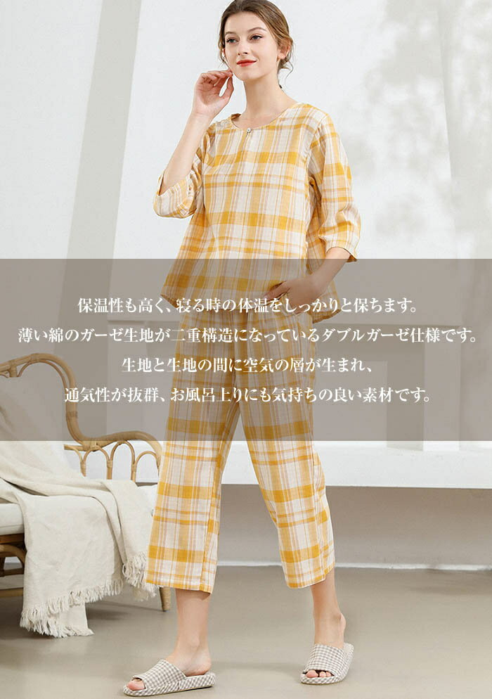 パジャマ ダブルガーゼ ルームウェア レディース チェック 上下セット ワイドパンツ 綿100% 2重ガーゼ 春 夏 秋 涼しい ゆったり 七分袖 テーラー襟 丸襟 ナイトウェア 寝やすい 部屋着 おしゃれ お洒落 きれい 可愛い 入院 産後 マタニティ 母の日 ギフト