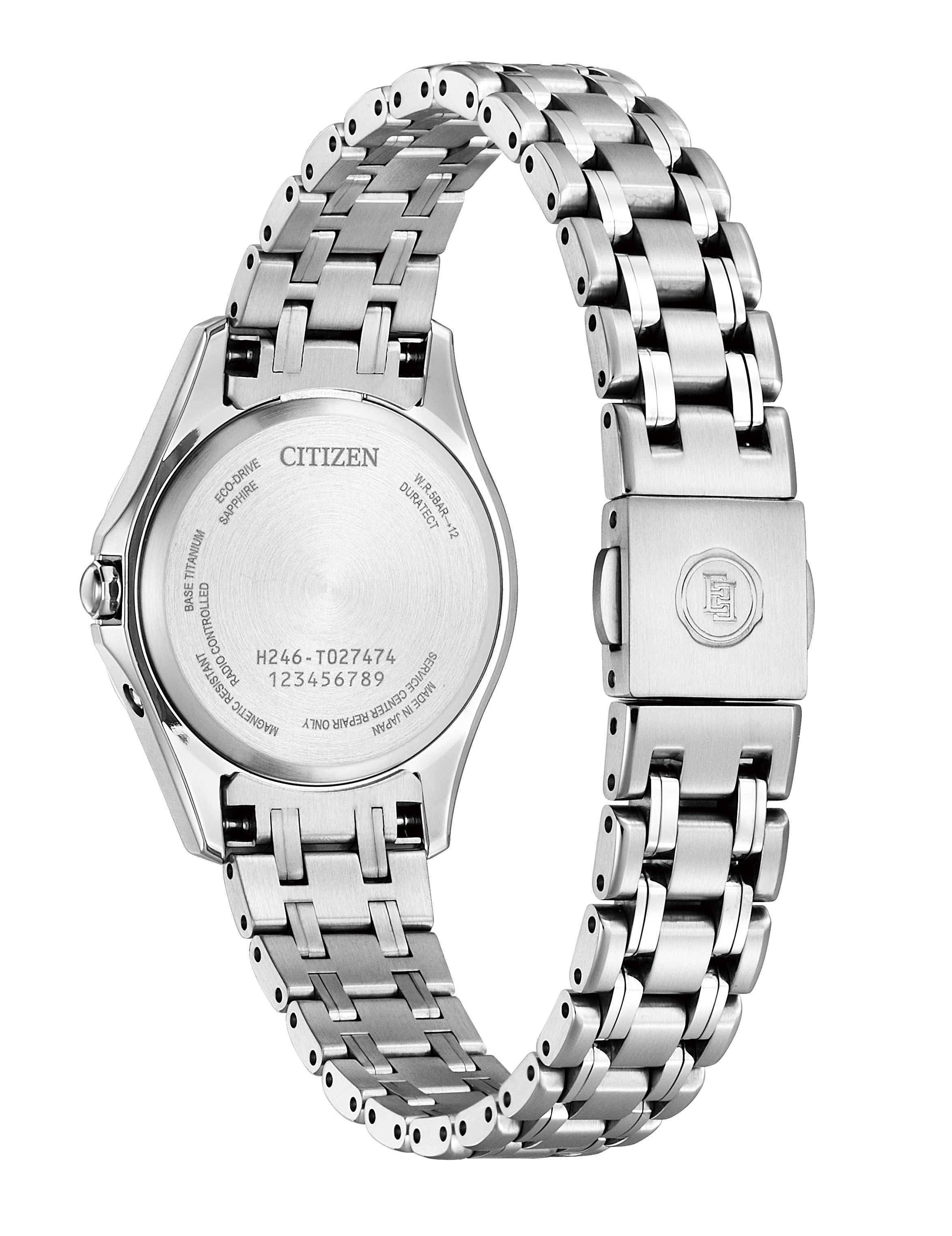 ) 【製品スペック】 商品番号:EC1120-59F キャリバーNo.:H246 動力:光発電エコ・ドライブ 精度:±15秒/月(非受信時) 持続時間:光発電3年(パワーセーブ作動時) 電波受信:日中欧米電波受信 重量:41g 厚み:8.1mm ケースサイズ:横 29.2mm ケース素材:スーパーチタニウム ケース表面処理:デュラテクトプラチナ(ライトシルバー色) バンド素材・タイプ:スーパーチタニウム/三ツ折れプッシュタイプ バンド幅:14.0mm バンド調整可能サイズ:135~184mm ガラス:球面サファイアガラス(クラリティ・コーティング) 防水性能:5気圧防水 アレルギーレベル:耐ニッケルアレルギー 耐磁性能:耐磁1種 デザイン特徴:文字板:2ポイントダイヤ入 【機能】 充電残量表示機能 充電警告機能 過充電防止機能 パワーセーブ機能 フル充電時約3年可動(パワーセーブ作動時) 日中米欧電波受信 受信局自動選択機能 定時受信機能 強制受信機能 パーペチュアルカレンダー 日付表示 ダイレクトフライト ワールドタイム(24時差) サマータイム機能 パーフェックス(JIS1種耐磁、衝撃検知機能、針自動補正機能) 原産国:日本製 メーカー保証 1年間メーカー保証 (MY CITIZENご登録により2年間) ※重量、厚み、サイズは参考値としてご参照ください。